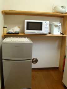 一般家庭の台所とほぼ同じです。流し、ガス台、冷蔵庫、電子レンジ、湯沸しポット、炊飯器‥‥。特に不自由はありません。 |
